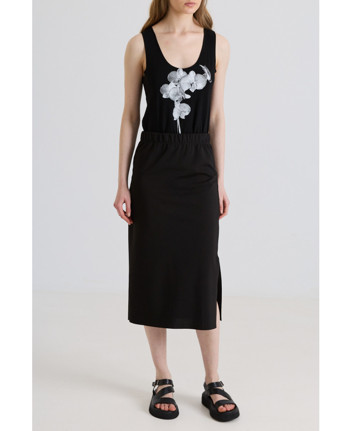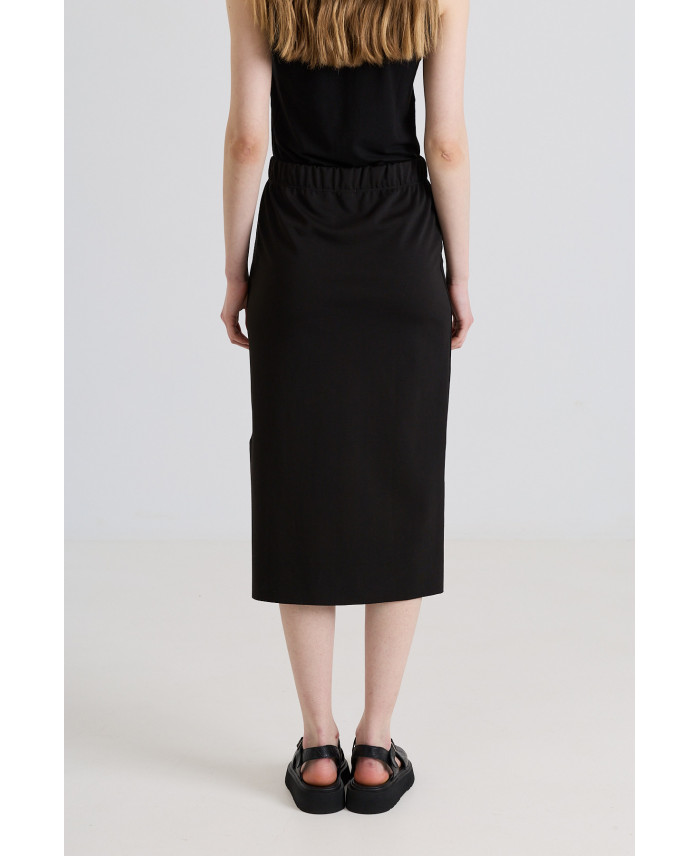 Faldilla de forma recta i teixit elàstic, està dissenyada per ser una peça còmode i molt versàtil, perfecta per combinar amb jaqueta curta i llarga. Cinturilla amb goma elàstica i obertura al baix. Teixit de gramatge mitjà que ajuda a definir la silueta sense marcar. Faldilla d'estil minimalista creada per utilitzar durant vàries estacions de l'any. Combina molt bé amb sneakers i sandàlies a l'estiu. Perfecte per viatjar, no necessita planxa.