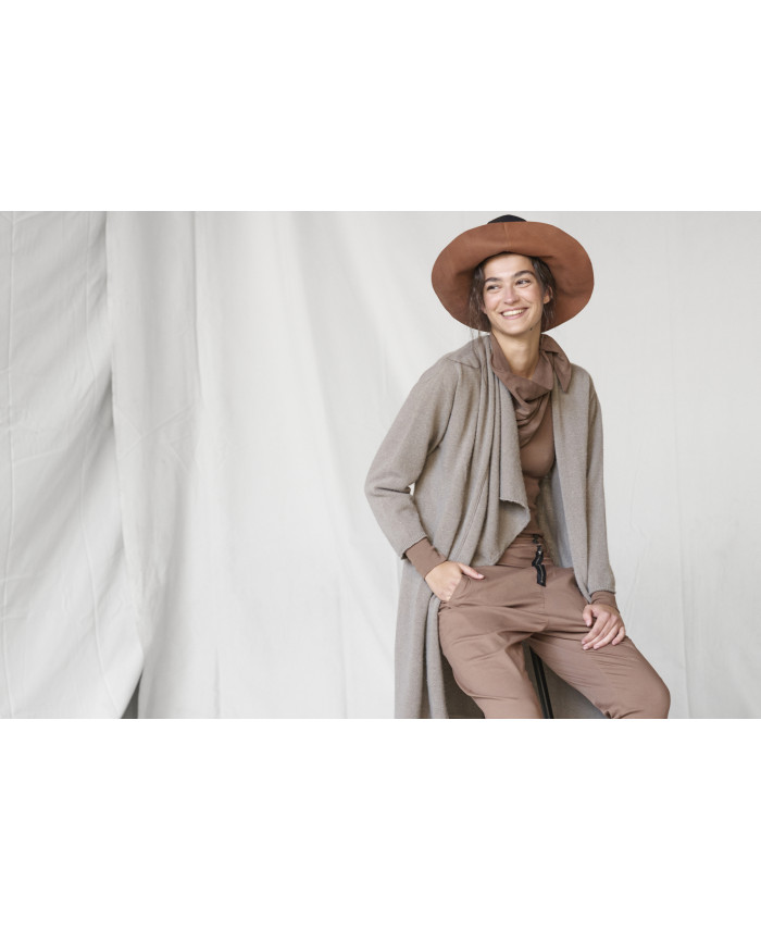 La peça més versàtil de la col·lecció d'hivern. Jaqueta de forma recte i hombro caigut. Cordat desplaçat marca de la casa amb botons metàlics a pressió. Teixida amb un fil de caiximira d'alta qualitat, molt suau i amb una caiguda molt afavoridora. Elegància i i calidesa estan garantits i combina perfectament amb els pantalons i vestits de la col·lecció. D'estil minimalista, perfecte pel teu dia a dia.