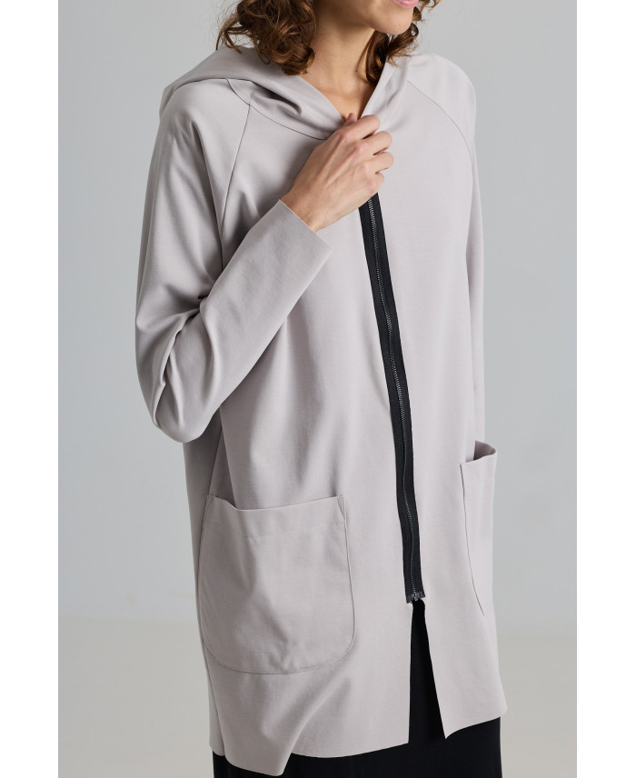 Una de les peces essencials d'aquesta col·lecció. Parka d’estil minimalista, de forma àmplia, tall recte i caputxa. El tancament amb cremallera de doble carro la fa molt còmode i versàtil. Màniga ranglan que afavoreix el moviment i butxaques de plastró al davant. Ideal per combinar amb tot tipus de pantalons i vestits. Produïda amb teixit de gramatge mitjà i elàstic que li ofereix una calidesa i confortabilitat extraordinàries. Una de les peces ideals per viatjar gràcies a la seva lleugeresa.