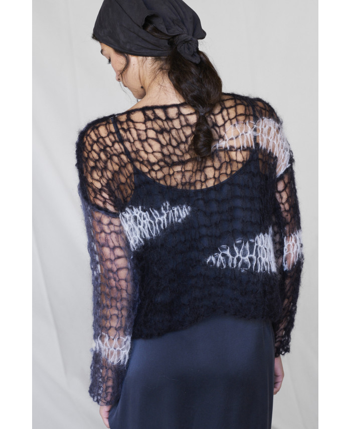 Jersei teixit a mà amb mohair extra suau produït per artesanes especialitzades en la tècnica de la mitja. Forma oversize que combina dos colors i el fa molt especial gràcies al punt obert que deixa entreveure la part de sota. Combina molt bé amb samarreta entallada màniga llarga ó samarreta sense mànigues per aconseguir l’efecte de canvi de color. Les petites variants en la forma i en el disseny formen part d’aquest jersei i es poden produïr en la producció.
