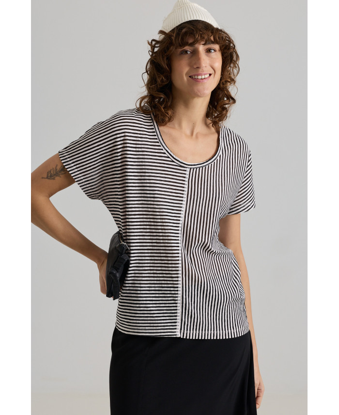Samarreta de coll semi-barca i forma recta. El seu disseny juga amb la direcció de les ratlles per crear una peça marca de la casa. Teixit molt lleuger i elàstic, amb una caiguda molt afavoridora. Ideal per combinar amb peces minimalistes.