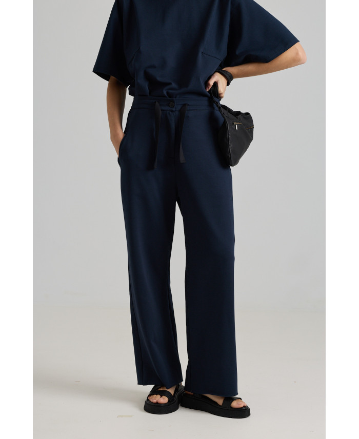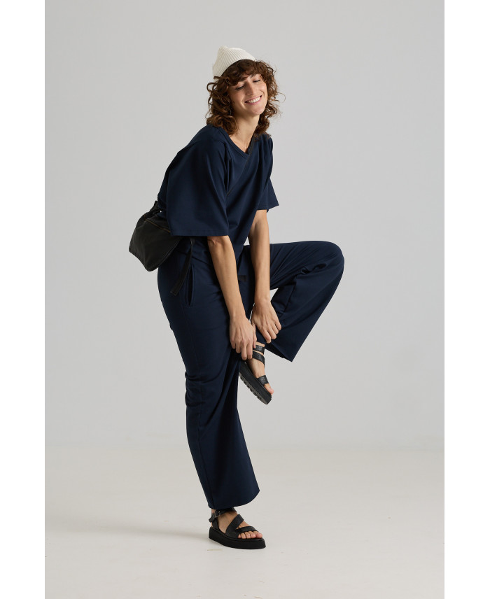 Pantaló de forma ampla, creat per no cenyir-se al cos. Goma elàstica a la cinturilla de l’esquena per adaptar-se a la varietat de formes. Butxaques sastre i detall de cintes al davant. Obertura amb cremallera a la bragueta i botó a la cintura. Teixit elàstic de gramatge mitjà molt còmode i càlid. Una peça molt versàtil i còmode que combina molt bé amb tot tipus de jaqueta i varietat de calçat. Ideal per viatjar, no necessita planxa i no s'arruga.