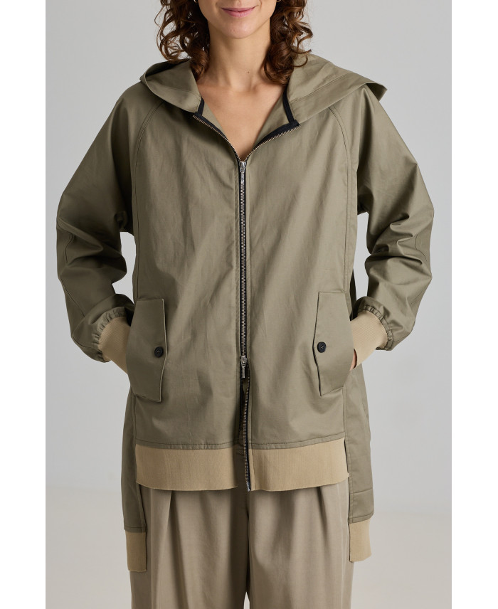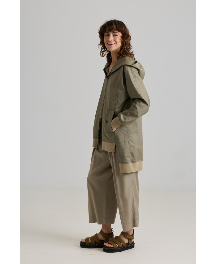 Una de les peces més especials de la col·lecció. De forma oversize i sisa ranglan. Botons amagats al davant i 4 butxaques de plastró i amb cremallera, marca de la casa. Canalé al coll i als baixos. Reforç a les costures amb doble repunt. De forma irregular al baix i amb obertura lateral i a l’esquena per afavorir el moviment. Teixit de pes mitjà, de tacte suau i molt còmode. No va folrada.