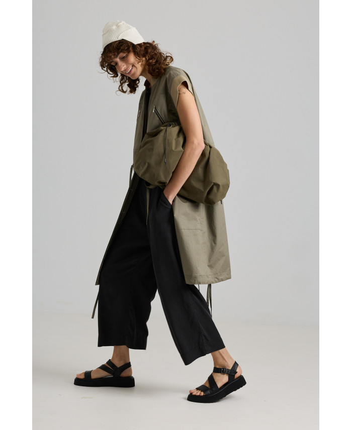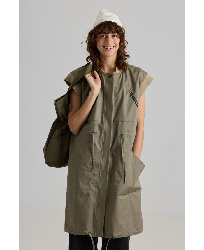 Una de les novetats que no et pots perdre. Armilla de forma recta i botons amagats. Consta de 4 butxaques al davant i cinta reguladora a la cintura. Canalé al coll i a la sisa. Detall de cinta al baix i obertura a la part de l’esquena. Una peça molt versàtil que combina amb tot tipus de peces. El seu teixit la fa ideal per la primavera i la tardor. No va folrada.