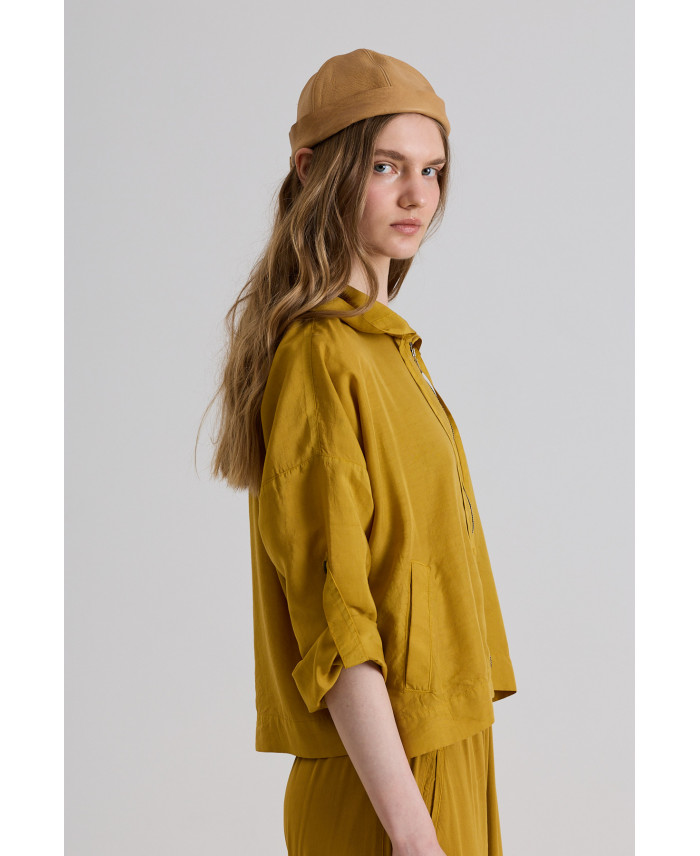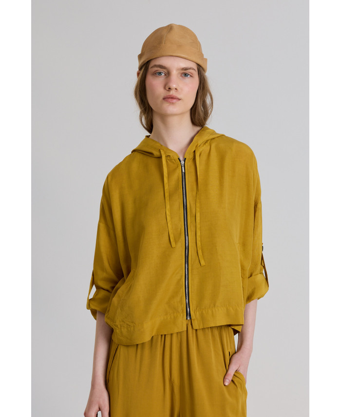Una de les jaquetes més exitoses pels vespres d'estiu. De forma oversize i caputxa. Consta de butxaques sastre frontal i tancament amb cremallera. Detall de cinta i botó al colze per tal de mantenir la màniga a mida tres quarts. El seu patró ampli i teixit de gran fluïdesa li donen gran comoditat a la peça.