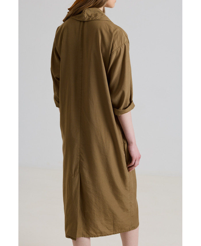 Un vestit que destaca pel seu patronatge únic amb sobreposició de volums. De forma recta i màniga ¾. Destaca el coll creuat que es fusiona amb el cos tot formant les butxaques del davant. Detall d’obertura a l'esquena per a una millor mobilitat. Creat amb teixit fresc, lleuger i d’una fluïdesa molt afavoridora. Serà ideal per moltes ocasions diferents tot combinant calçat diferent.