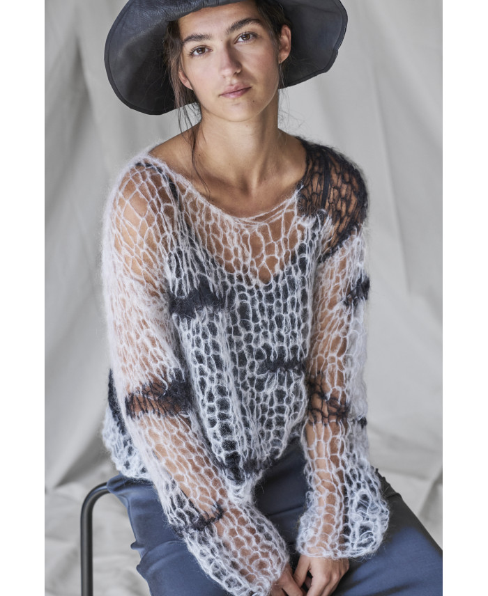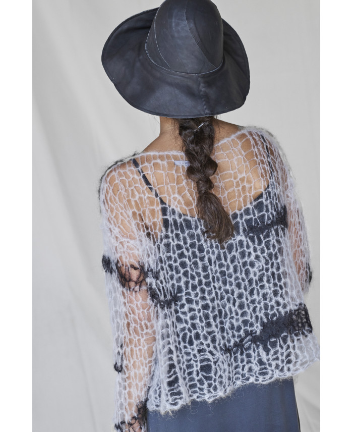 Jersei teixit a mà amb mohair extra suau produït per artesanes especialitzades en la tècnica de la mitja. Forma oversize que combina dos colors i el fa molt especial gràcies al punt obert que deixa entreveure la part de sota. Combina molt bé amb samarreta entallada màniga llarga ó samarreta sense mànigues per aconseguir l’efecte de canvi de color. Les petites variants en la forma i en el disseny formen part d’aquest jersei i es poden produïr en la producció.