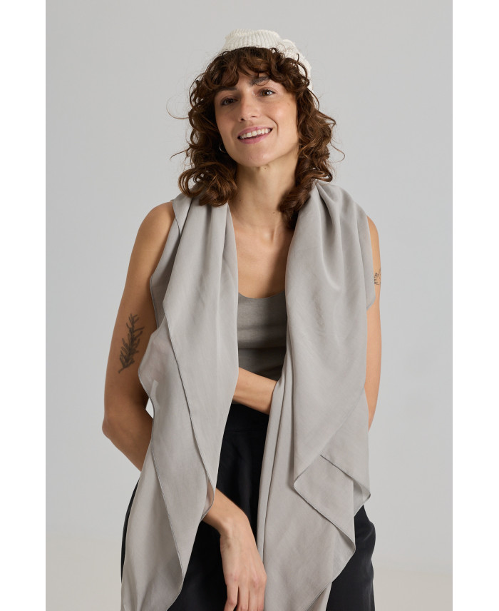 Una pieza muy versátil para los días más frescos y las tardes de verano. Creado con un tejido muy suave de gramaje extra ligero. Detalle de acabado con ribete bordado. Las diferentes opciones de posición hacen de este fular una prenda ideal para diferentes ocasiones. Sus dimensiones permiten anudarlo a la cintura en forma de "pareo".