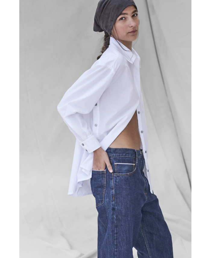 El pantalón estrella de la colección, con un patrón característico de la marca, bragueta desplazada y forma recta. Ceñido en la cintura y cadera. Bragueta con cremallera y 5 bolsillos. Bolsillo sastre en la pernera y bolsillos de plastrón en la espalda con detalle del ribete. Creado con un denim reciclado muy resistente y de alto gramaje, ideal para un uso intensivo y de larga durabilidad.