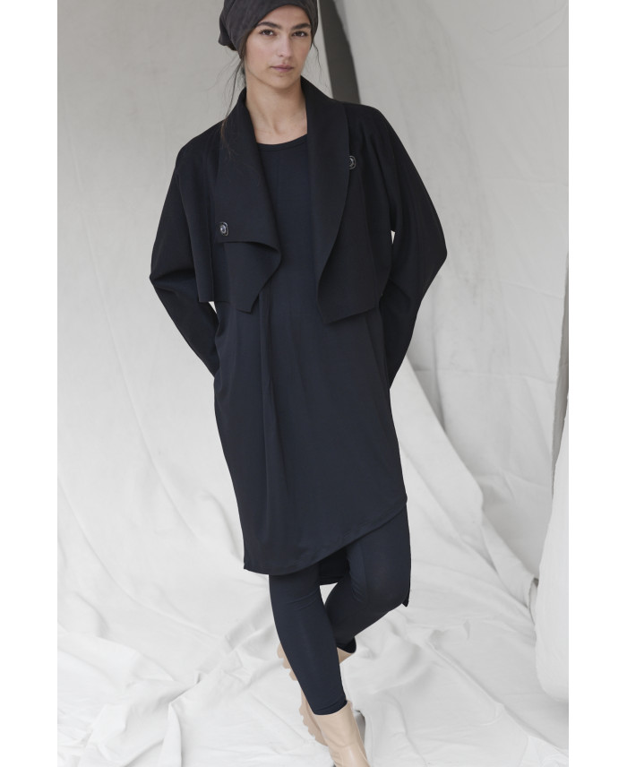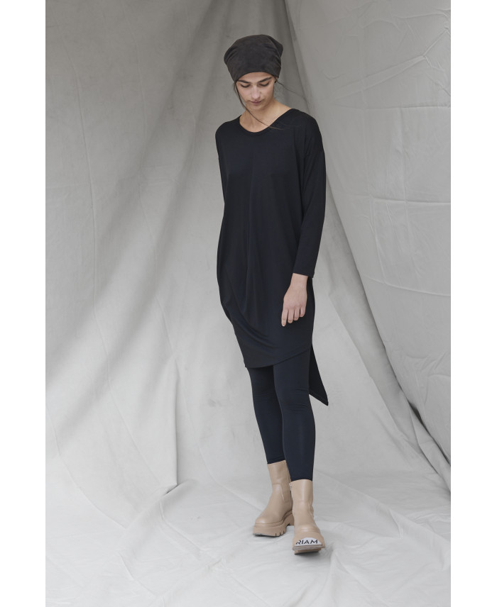 Versatilidad es la palabra que describe el nuevo vestido de forma irregular y estilo minimalista. De forma recta, manga larga y cuello redondo. Detalle de pinza drapeando el delantero y bajo irregular. Destaca su tejido elástico muy fluido y favorecedor. Para las diferentes estaciones, el tipo de calzado marcará la diferencia. Ideal para combinar con leggings o medias en invierno.