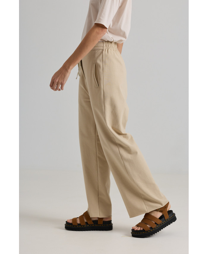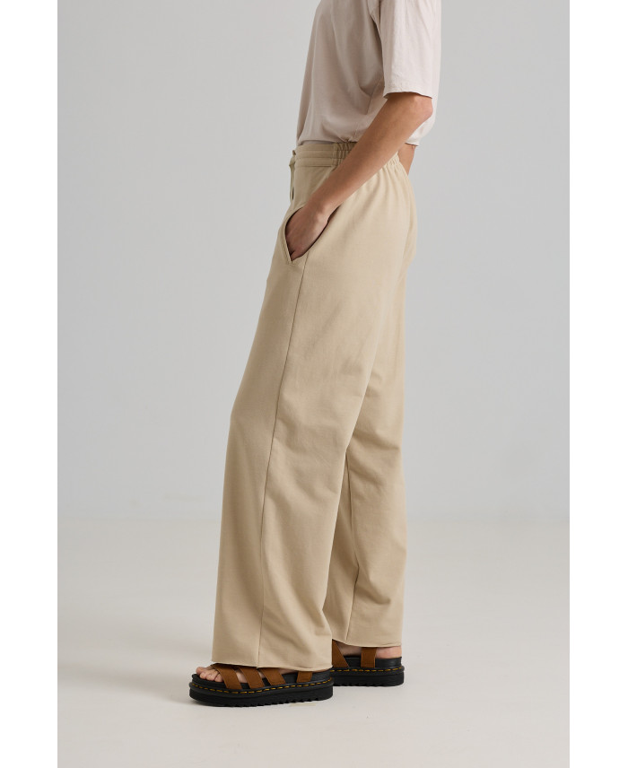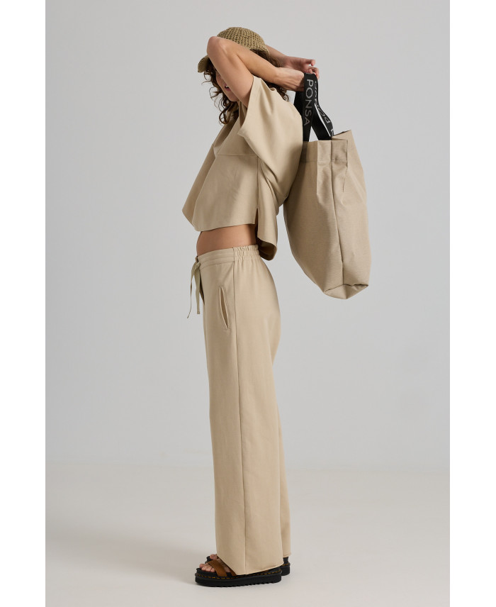Pantalón de forma ancha, creado para ser una prenda holgada. Goma elástica en la cinturilla de la espalda para adaptarse a la variedad de formas. Detalle de cintas en la cinturilla. Apertura con cremallera en la bragueta y botón en la cintura. Bolsillos sastre en frente. Tejido elástico de gramaje medio, muy cómodo y cálido. Una prenda muy versátil que combina con todo tipo de chaquetas y calzado.