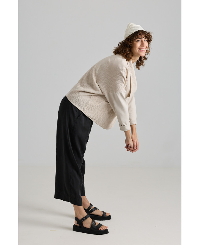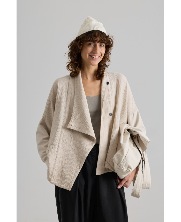 Una chaqueta que no te dejará indiferente por su versatilidad y comodidad. De corte oversize y maxi solapa atada a un lado. Sisas caídas y generosas que combinan dos tejidos. Bolsillos plastrón en el frente. Tejidos de peso ligero, muy agradables al tacto. Ideal para viajar. No está forrada.