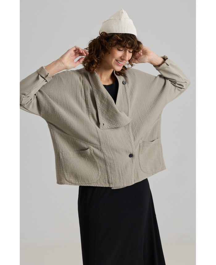 Una chaqueta que no te dejará indiferente por su versatilidad y comodidad. De corte oversize y maxi solapa atada a un lado. Sisas caídas y generosas que combinan dos tejidos. Bolsillos plastrón en el frente. Tejidos de peso ligero, muy agradables al tacto. Ideal para viajar. No está forrada.
