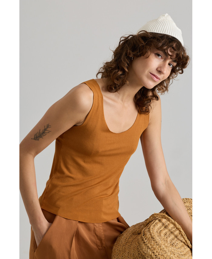 Una de las prendas imprescindibles para el verano. Camiseta de forma ceñida y diseño minimalista. Tejido elásticos muy ligeros y cómodo. Detalle de los acabados al vivo (taglio vivo). Pieza perfecta para combinar como pieza interior en petos y todo tipo de prendas.