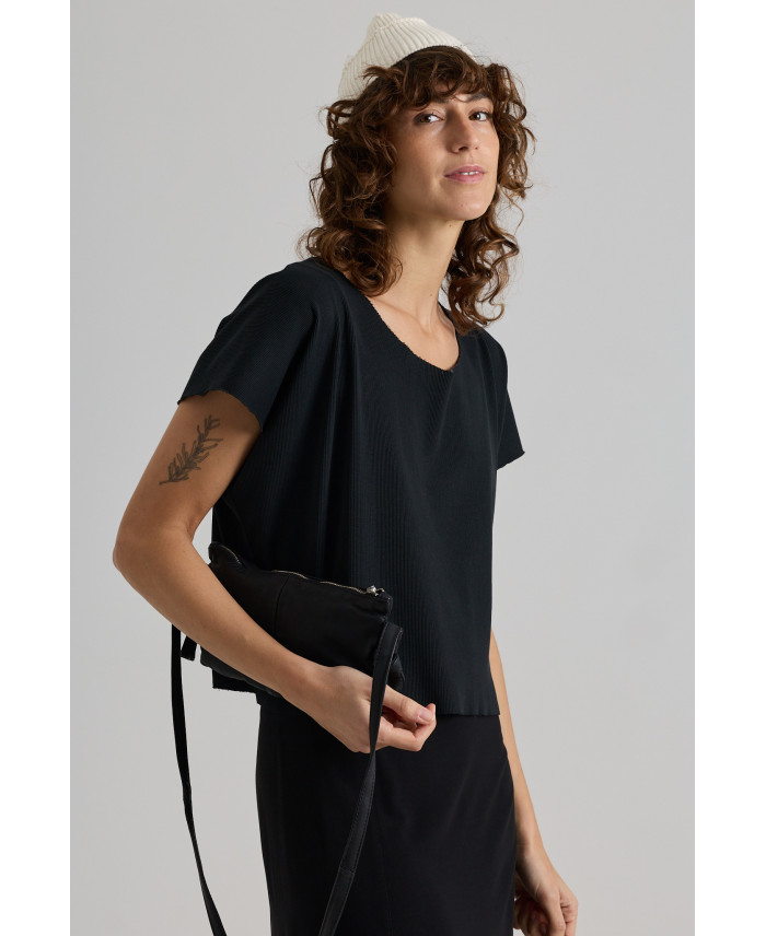 Camiseta de estilo minimalista, de forma oversize y cuello barco. Máxima comodidad gracias a su tejido de canalé de gramaje medio, muy elástico y con una fluidez especial. Pieza ideal para combinar con todo tipo de pantalones, faldas y chalecos.