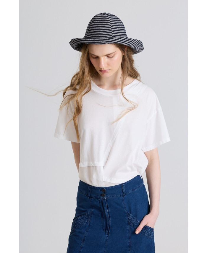 Una camiseta muy especial gracias a su diseño. De corte recto, sisa caída y manga corta. Destaca por la combinación de tejidos, marca de la casa. Detalle de bajo asimétrico y abertura en la parte delantera y en la espalda.