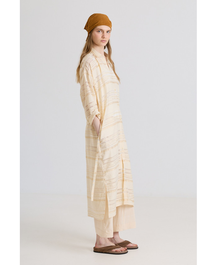 Vestido camisero de forma oversize, hombro caído y manga 3/4. Cuello camisero y bolsillos laterales invisibles. Diversidad de colocación de la prenda gracias al cinturón extraíble que puede ceñirla a la cintura. Aberturas laterales en los bajos para favorecer el vuelo de la prenda. Ideal para superponer con otras prendas o para usarla sola como vestido.