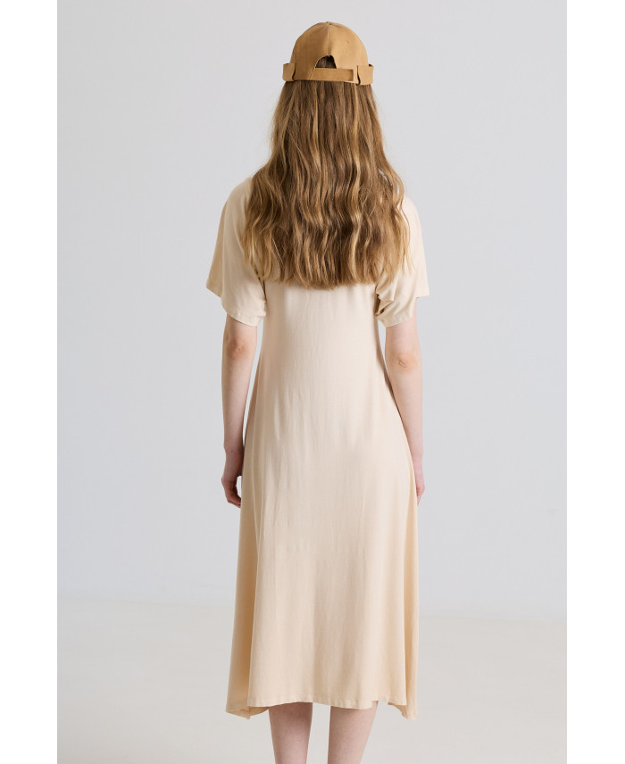 El nuevo vestido creado con patrón minimalista marca de la casa. Comfort es la palabra para describir este vestido de forma ceñida a la cintura y evasé en el bajo. Destacan las tiras en la sisa y la manga ancha. Creado con tejido muy elástico y fluido que ayudan a dibujar la silueta de forma orgánica y amable. Su diseño es ideal para combinar con todo tipo de calzado.