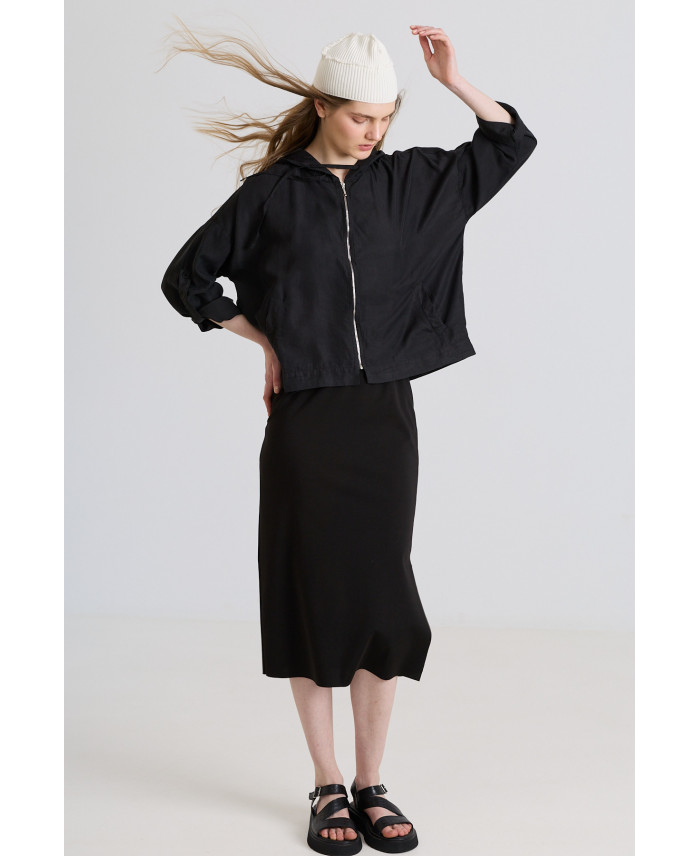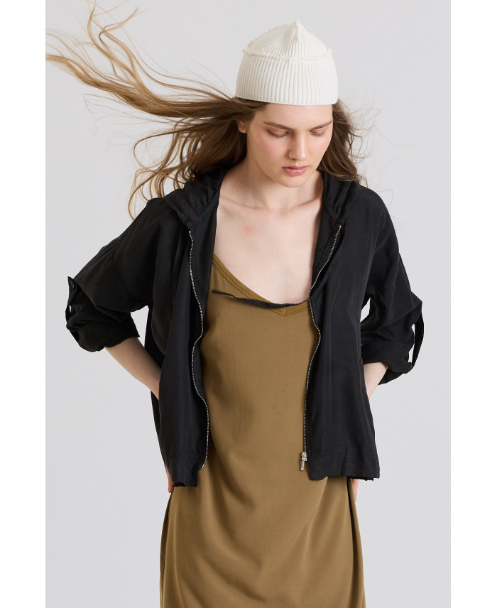 Una de las chaquetas más exitosas para las tardes de verano. De forma oversize y capucha. Consta de bolsillos sastre frontales y cierre con cremallera. Detalle de cinta y botón en el codo para poder mantener la manga a medida tres cuartos. Su patrón amplio y tejido fluido le dan gran comodidad a la prenda.