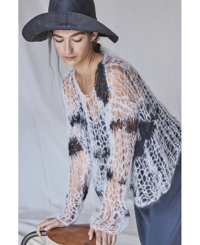 Jersey tejido a mano con mohair extra suave producido por artesanas especializadas en la técnica del punto de media. Forma oversize que combina dos colores y la hace especial gracias al punto abierto de la malla. Combina muy bien con camiseta entallada manga larga ó sin mangas para conseguir efectos de color. Las pequeñas variantes en la forma y el diseño forman parte de éste jersey y se pueden producir en la producción de la pieza.