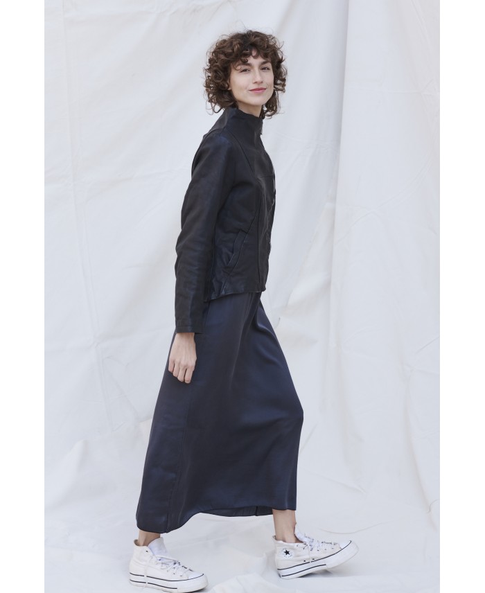 Chaqueta marca de la casa, se ha convertido en una de las piezas más deseadas, una pieza icónica de MIRIAM PONSA. De forma ceñida, muy favorecedora. Detalle de multicosturas y bolsilos en las costuras delanteras. Cremallera de alta calidad desplazada en el delantero. La piel se somete a un proceso de lavado para conseguir un efecto mate y desgastado. La piel es ligeramente elástica, muy confortable en hombros y espalda. La parte interior está forrada con tejido de algodón. Una de las prendas más duraderas y especiales de la colección.