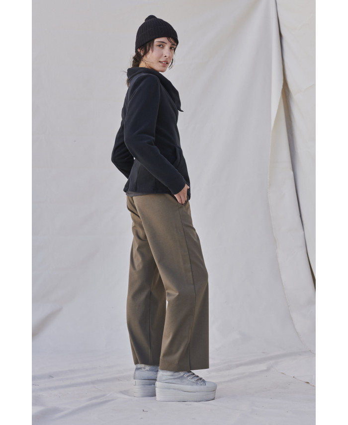 Pantalón de forma ancha, creado para ser una prenda holgada. Goma elástica en la cinturilla de la espalda para adaptarse a la variedad de formas. Detalle de cintas en la cinturilla. Apertura con cremallera en la bragueta y botón en la cintura. Bolsillos sastre en frente. Tejido muy cómodo, elástico y cálido. Una prenda muy versátil y cómoda que combina muy bien con chaqueta corta y calzado deportivo.