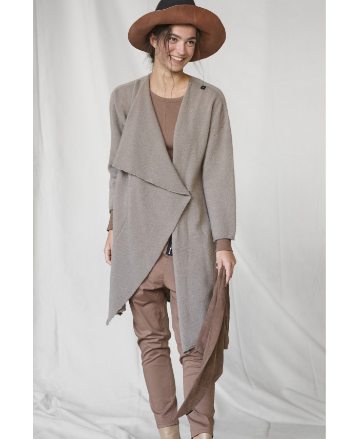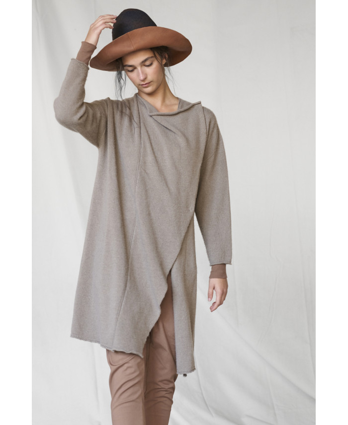 The most versatile piece for the winter time. Jacket with a straight shape and dropped shoulders. Signature opening, displaced and fastened with metal snap buttons. Woven with high quality cashmere yarn, very soft and flattering drape. Elegance and warmth are guaranteed. Minimalist style, it combines perfectly with the pants and dresses of the collection.