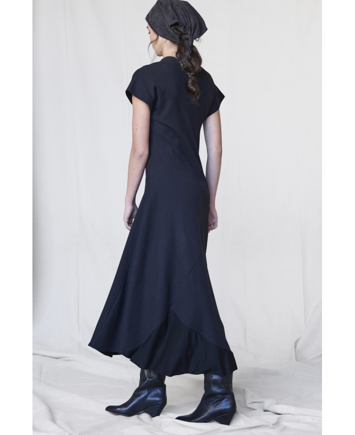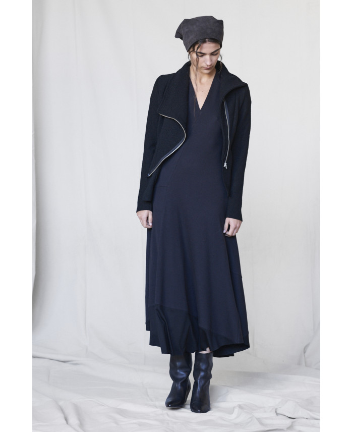 Favourite's designer dress. Waist-fitting shape and evase design. V-neck and short sleeves. Signature design with displaced seams and asymmetric hem. Crafted in medium weight ribbed cotton stretch jersey. Piece created for the best comfortable feeling, smooth and drapes with a graceful flow. Designed to combine with all types of garments, the best are oversize jackets and coats. Layer it up with cardis now, and wear on its own when the sun's shining.
