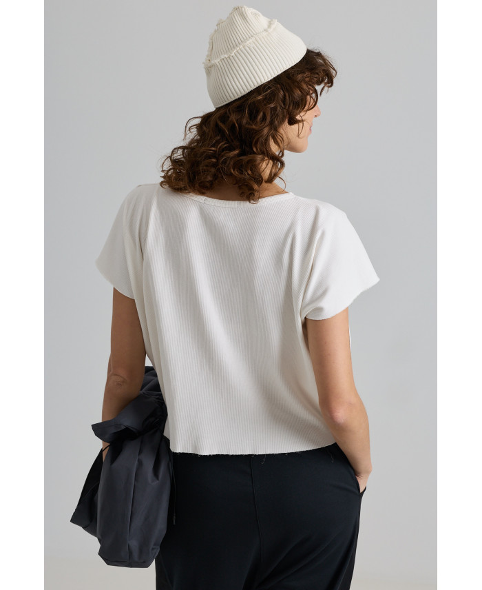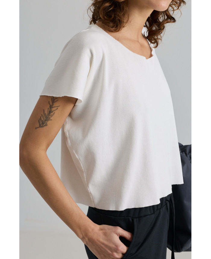 Minimalist style t-shirt with an oversize fit and boat neck. Maximum comfort thanks to its medium-weight ribbed knit fabric, which is very elastic and has a special fluidity. Ideal piece to combine with all types of trousers and skirts. Pairs very well with vests.