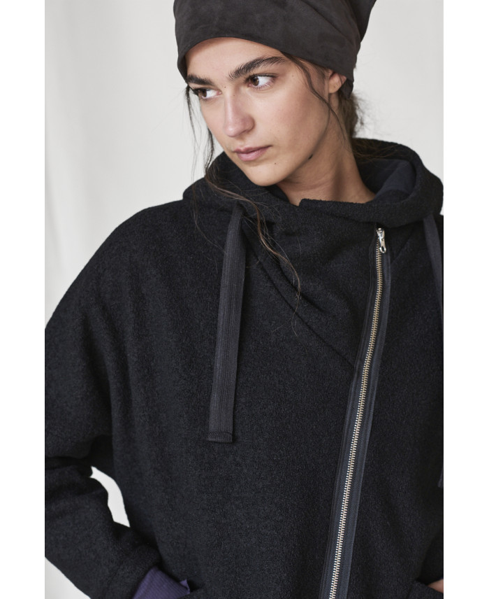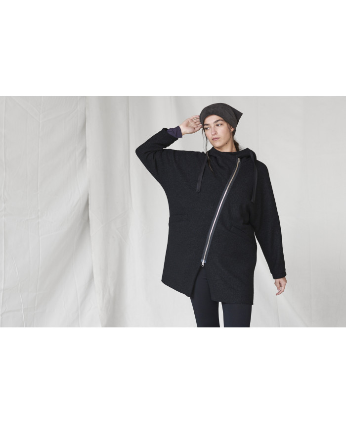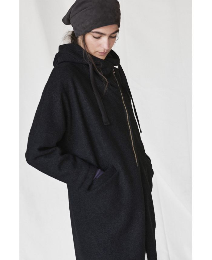 Your everyday coat with the signature fit. Straight form and signature hooded with oversize collar. Loose shoulder and minimal design. Two front tailoring pockets lined with warm polar fabric. Signature zip to closure. Elegance and warmth are guaranteed on this piece thanks to its fleece lining fabric. It combines very well with the leggings and dresses of the collection. Perfect for travelling thanks to its light weight.