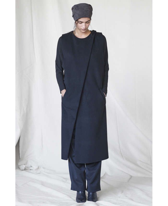 This piece will make you fall in love with its versatility. A straight-cut waistcoat with generous armholes and the brand's signature collar, which closes with an inner and outer button. It features irregular side seams and tailored pockets. The fabric is very warm with a high weight. It combines very well with all kinds of trousers and basic skirts. It is unlined thanks to the softness of its fabric.