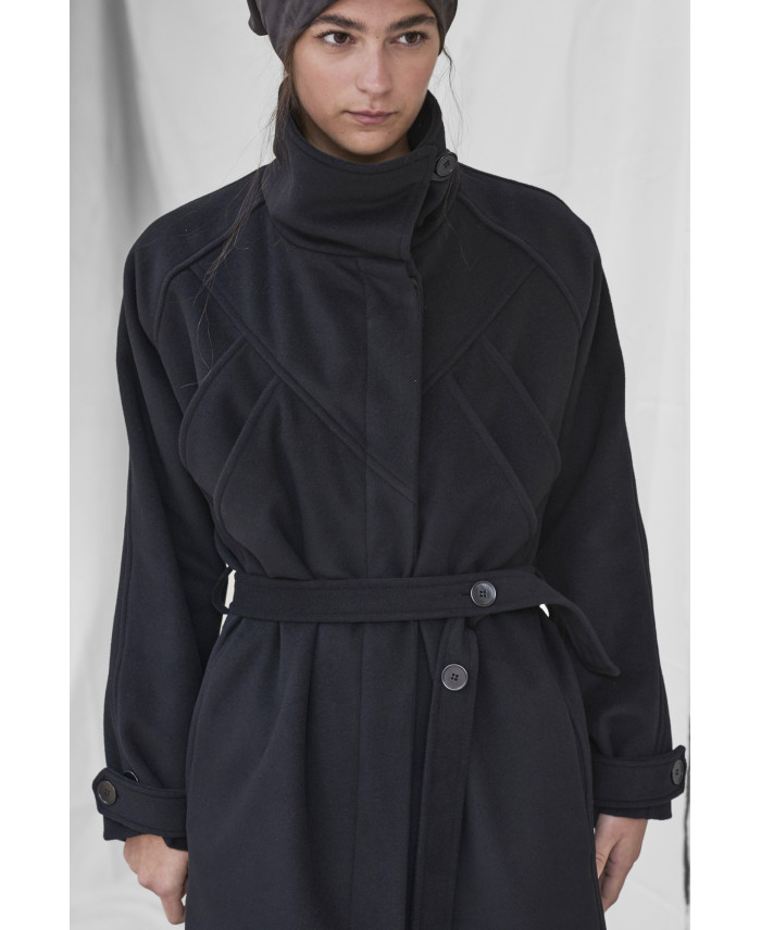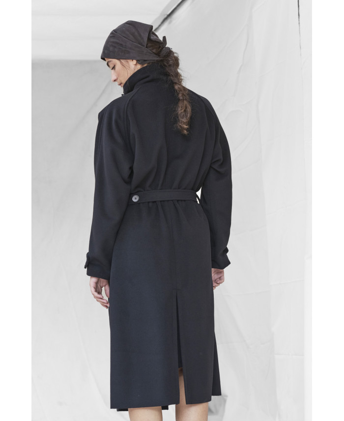 The star coat that combines elegance and warmth. Straight-fit coat with raglan sleeves. An oversized collar fastened with an outer button. It fastens with inner buttons on the front placket. It features a double chest pocket and two side pockets at the hip. A belt that can be fastened with eyelets and buttons. A slit detail at the back enhances the garment's comfort and movement. Elegance and warmth are guaranteed, and it pairs perfectly with the trousers and dresses from the collection. The coat is created with a high-quality, very warm and soft fabric. Perfect for the coldest winter days. This piece is lined.