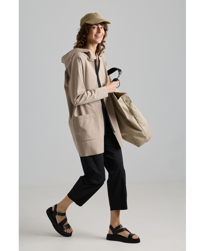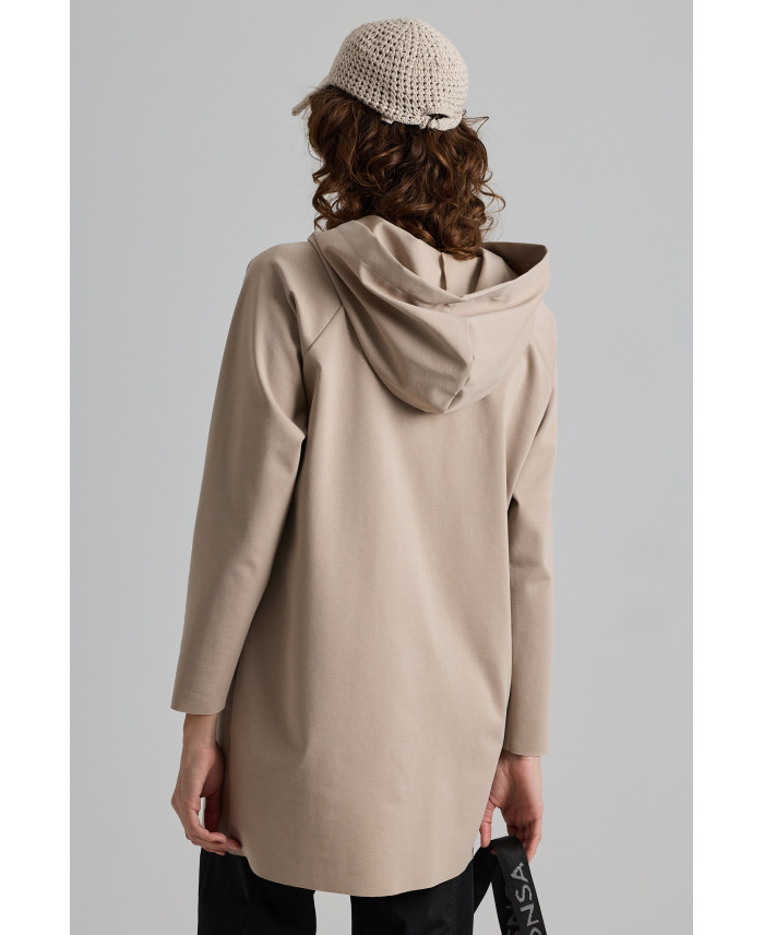 Hooded signature's parka, created for a loose fit and minimal style. High quality front zip closure and raglan sleeve. A piece that combines with slim fit trousers or leggings for a one piece style. Created for a sporty look. Designed with comfy, stretchy jersey to feel loose on the body. This is the perfect piece for travelling, thanks to its light weigh and comfy fabric.