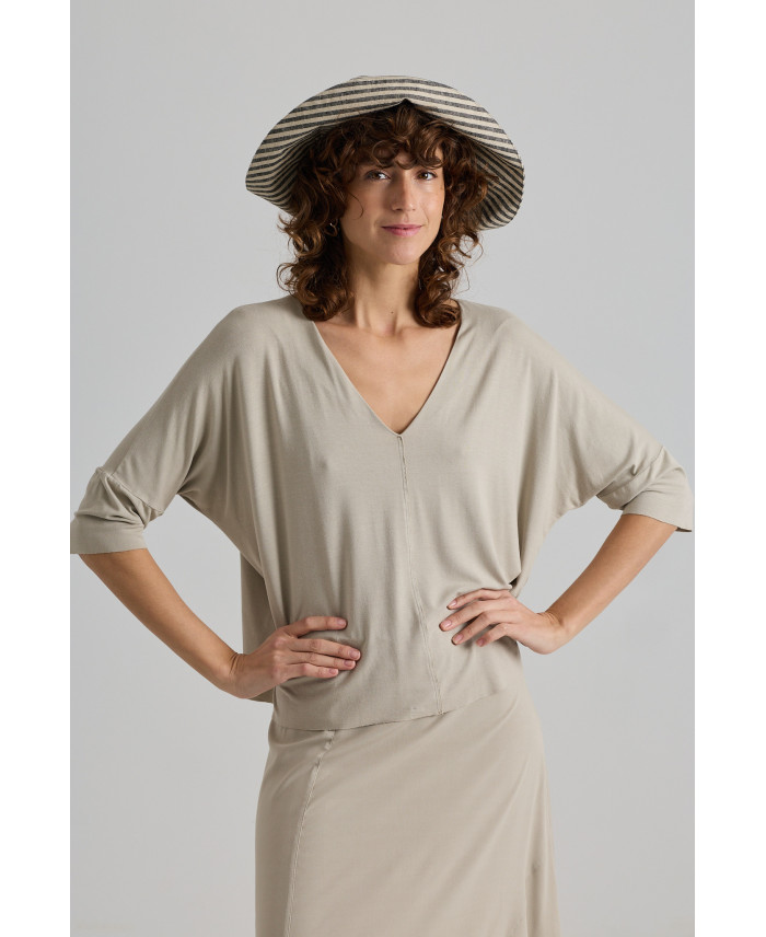 One of the must-have pieces of the season.Designed for versatility and comfort. Dropped armholes, a V-neck, and a central seam detail. ¾ sleeves. Oversized shape achieved through its mid-weight, highly stretchable fabric with a fluid drape.