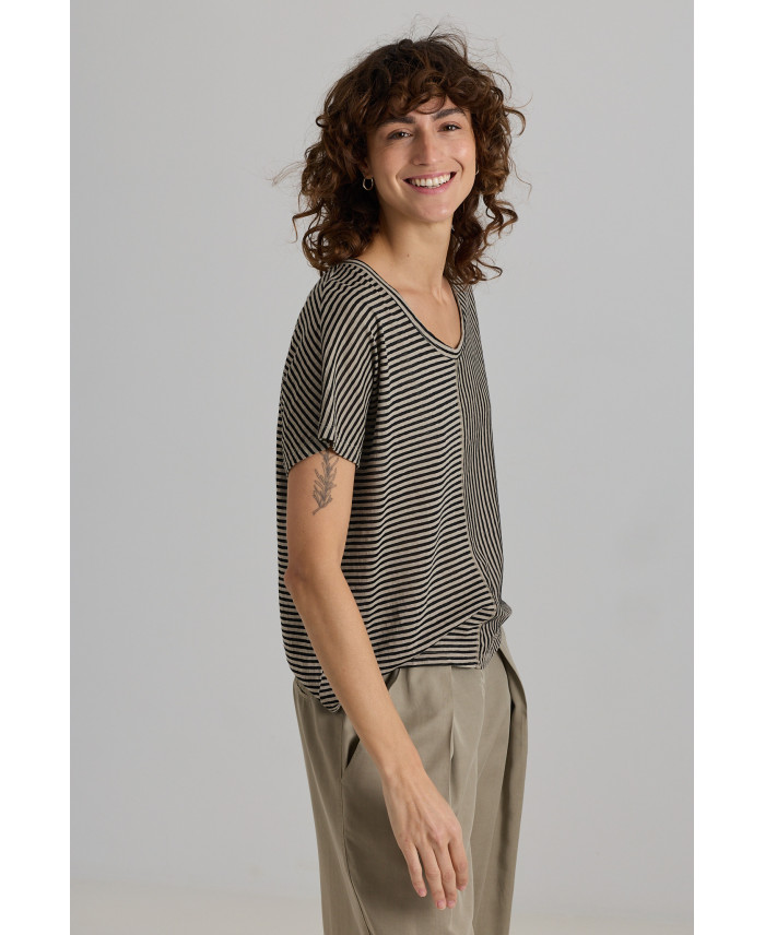 Straight-cut t-shirt with a semi-boat neckline. The interplay of stripes in different directions gives the garment a distinctive touch. Very lightweight stretch fabric with a highly flattering drape. Perfect for pairing with minimalist pieces.