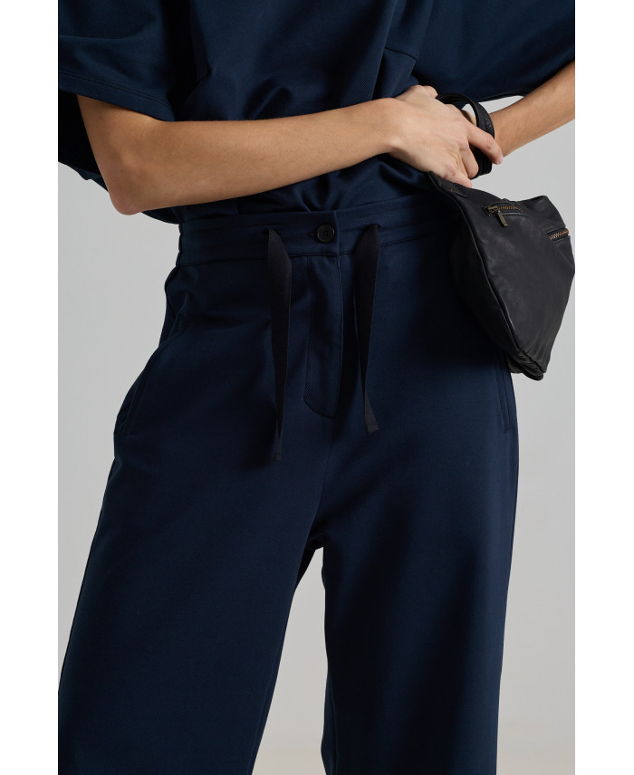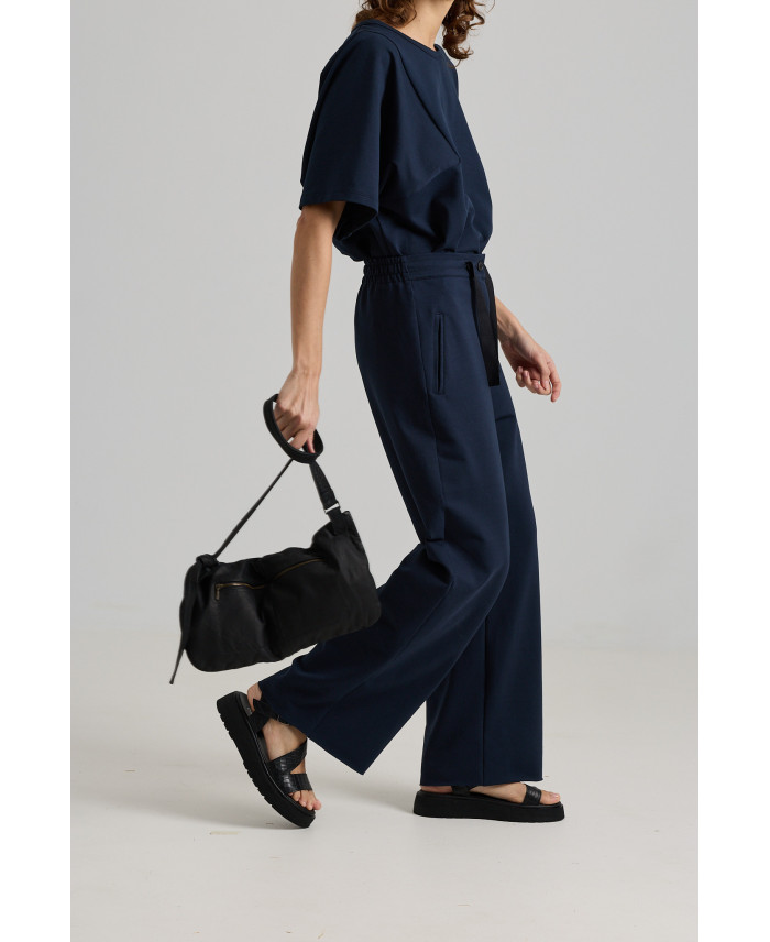Wide-shaped pants, created for a relaxed fit. Elastic band on the back waistband to adapt to a variety of shapes. Ribbon detail on front. Zipper opening on the fly and button at the waist. Tailored pockets in front. Very comfortable, elastic and warm fabric. A very versatile and comfortable garment that combines very well with all kind of jackets. This is the perfect piece for travelling, for its light weight and comfy fabric, it doesn't need to iron.