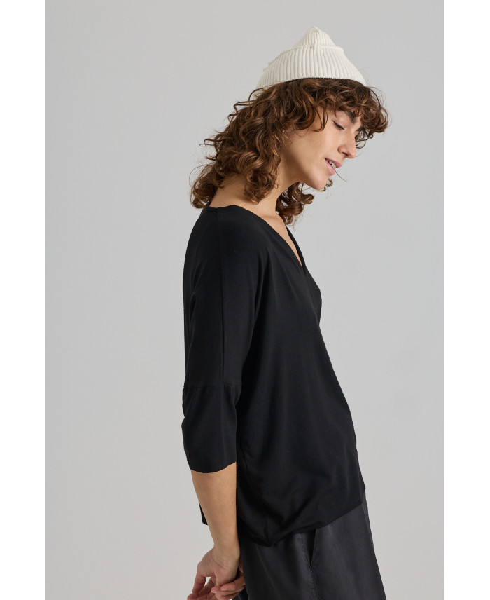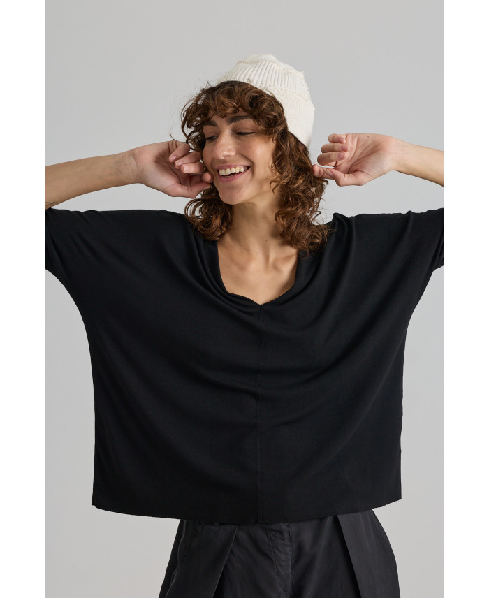 One of the must-have pieces of the season.Designed for versatility and comfort. Dropped armholes, a V-neck, and a central seam detail. ¾ sleeves. Oversized shape achieved through its mid-weight, highly stretchable fabric with a fluid drape.