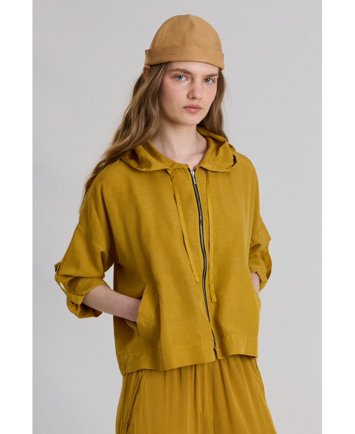 One of the most successful jackets for summer evenings. It features a hood and front tailored pockets. YKK zipper closure. Tape and button detail at the elbow to keep the sleeves at three-quarter length. Its loose fit and very fluid fabric give the garment great comfort.