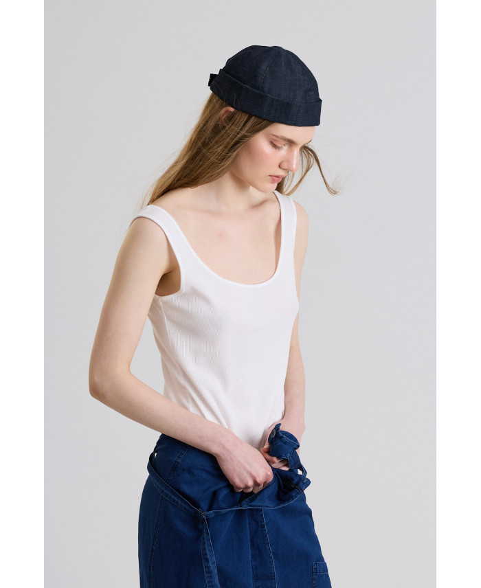 One of the essential basics for summer. T-shirt with a minimalist design, fitted shape and very elastic thin ribbed knit fabric. Perfect for layering as an undershirt for overalls and all kinds of garments. A basic piece that cannot be missing for the hottest days.