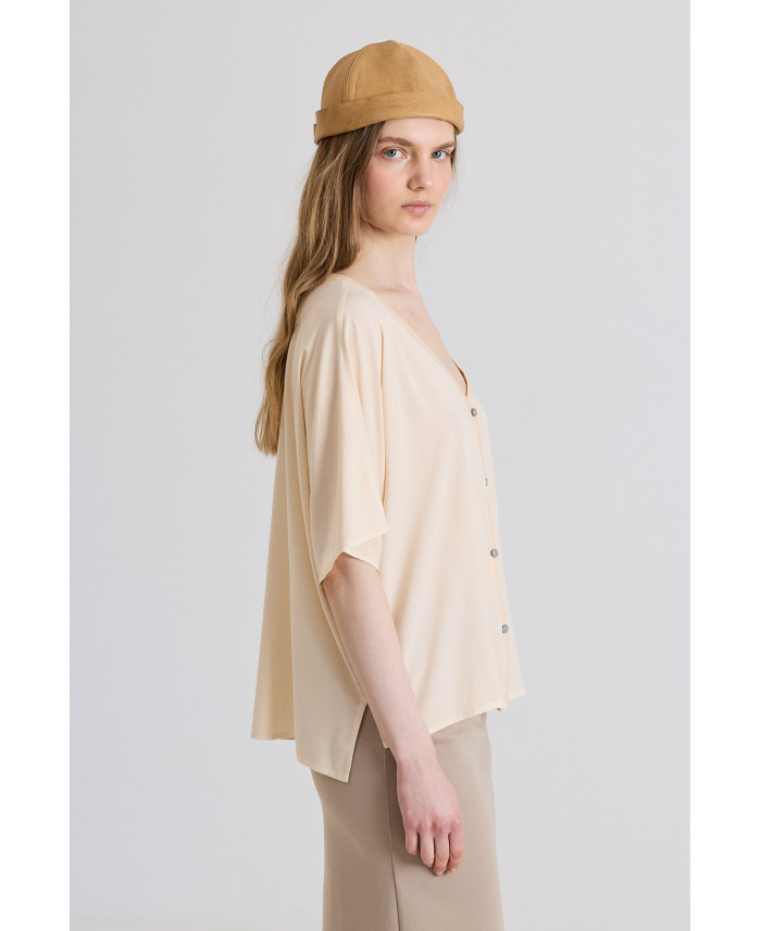 You will fall in love with its fluidity. Oversize fit and wide kimono sleeves. V-neck and a classic button-down front. Created with a soft, stretch fabric with a beautiful drape. Designed as an essential piece for many occasions, perfect to combine with all types of trousers and skirts.