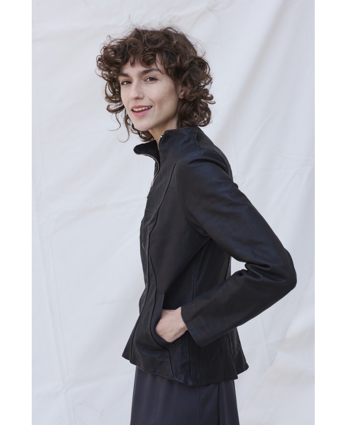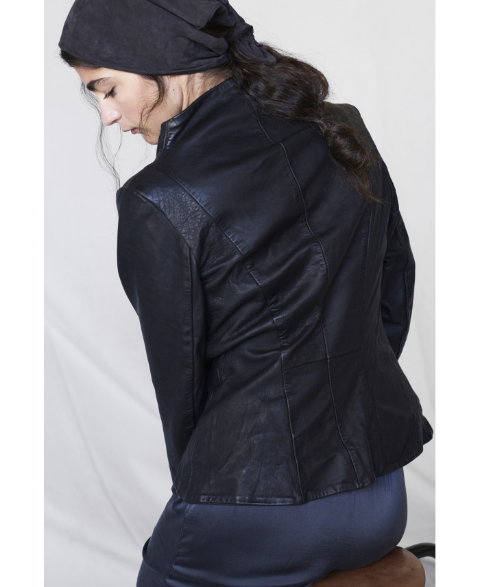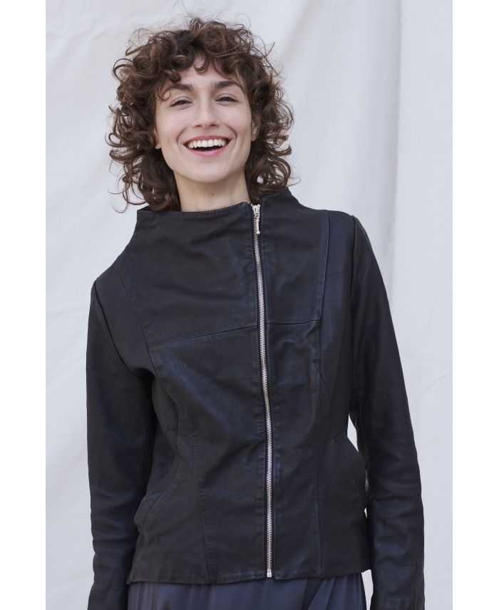 Designer’s favourite fitted leather jacket. Front displaced zipper and pockets on front seams for this fitted garment. The leather has gone through a washing process that gives to it an aged look. The leather is slightly elastic, thus very comfortable in the shoulders and back. The inner part is lined with cotton fabric. Very special piece made as timeless and long life one.